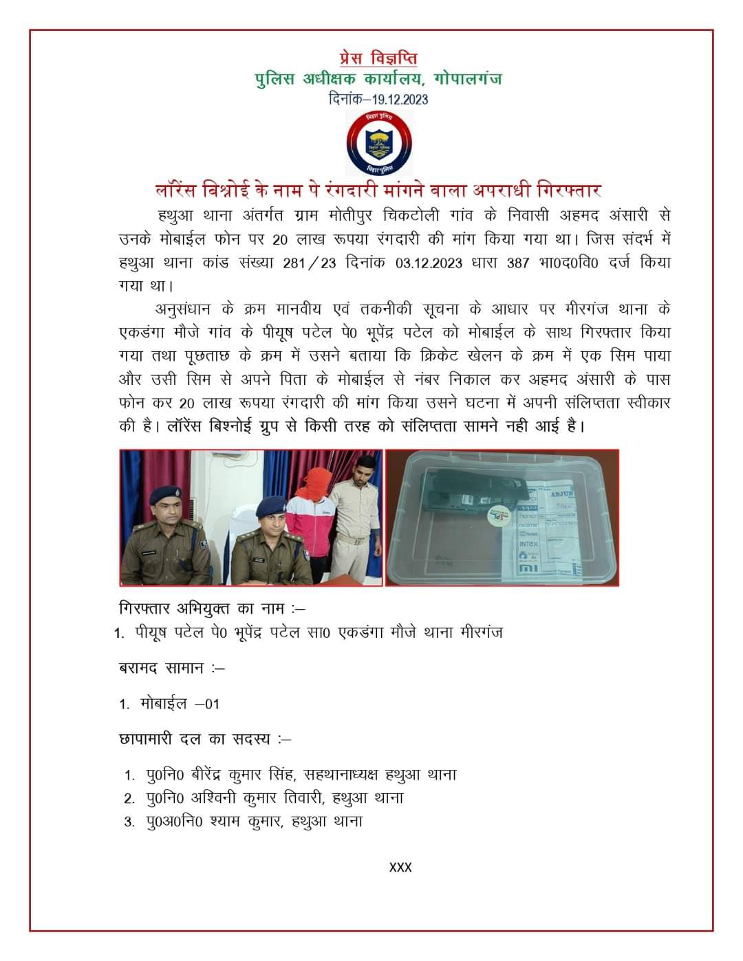 हथुआ पुलिस ने एकडंगा मौजे से पीयूष पटेल को गिरफ्तार किया है। उसने गैंगस्टर लॉरेंस बिश्नोई के नाम पर व्यवसायी से 20 लाख रुपये की रंगदारी मांगी थी। ये पूरा मामला तीन दिसंबर का है, जब पीयूष पटेल ने गैंगस्टर लॉरेंस बिश्नोई के नाम पर 20 लाख रुपये की रंगदारी मांगी थी। हथुआ पुलिस की इस कामयाबी के बाद SDPO अनुराग कुमार ने प्रेस कांफ्रेंस कर पूरे मामले की जानकारी दी।