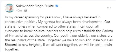 हिमाचल प्रदेश के मुख्यमंत्री सुखविंद्र सिंह सुक्खू ने शनिवार देर शाम को अपने सोशल मीडिया अकाउंट पर एक पोस्ट की। उन्होंने कहा कि कहा कि वर्षों के अपने कॅरिअर में हमेशा रचनात्मक राजनीति में विश्वास किया है। मेरा एजेंडा हमेशा विकास रहा है। हमारा राज्य अन्य राज्यों की तुलना में कम नहीं है। सुक्खू ने लिखा-मैं सभी का आह्वान करता हूं कि राजनीतिक बाधाओं को तोड़कर देश भर में हिमाचल की गरिमा को स्थापित करने में हमारी मदद करें। हमारे युवा, बुजुर्ग, हमारी बहनें राज्य के असली स्तंभ हैं। हमें मिलकर जीतना है और अपनी देवभूमि को नई ऊंचाइयों तक पहुंचाना है। अगर हम सब मिलकर काम करेंगे तो हम एक साथ जीत पाएंगे।